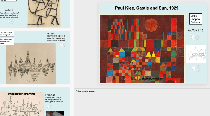 Includes three low mess activities, each one inspired by a piece of art by Paul Klee. The slides include audio prompts and instructions. You will need: At least 5 pieces of paper, drawing tools (pencil, biro, charcoal or felts) and colouring tools (paints, collage materials – scissors, glue, coloured paper or felts). Each of the three challenges should take 30mins – 1.5, depending on the individual.