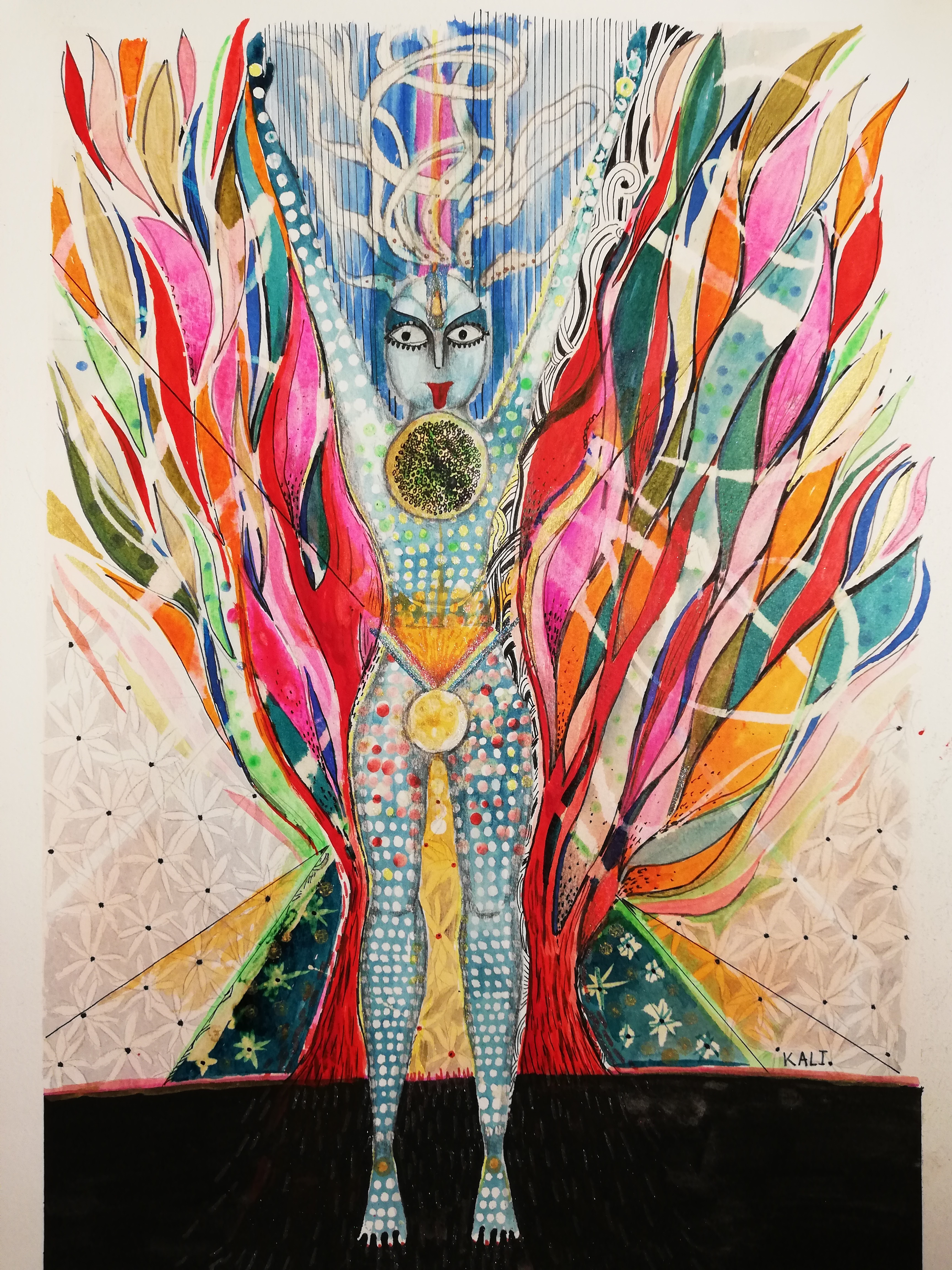 Kali represents the transformative power at the heart of all creation—the force that clears away what is stagnant so something new can emerge. In this piece, she stands as the embodied reminder that creativity can be an act of liberation – wild, intuitive, and profoundly alive.